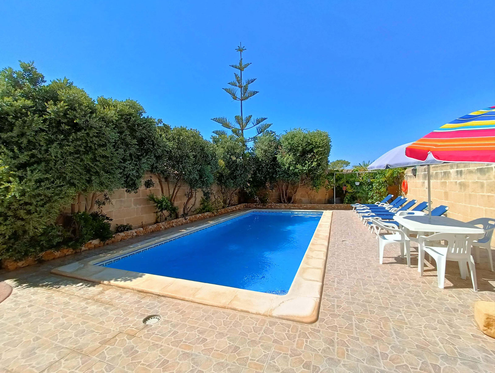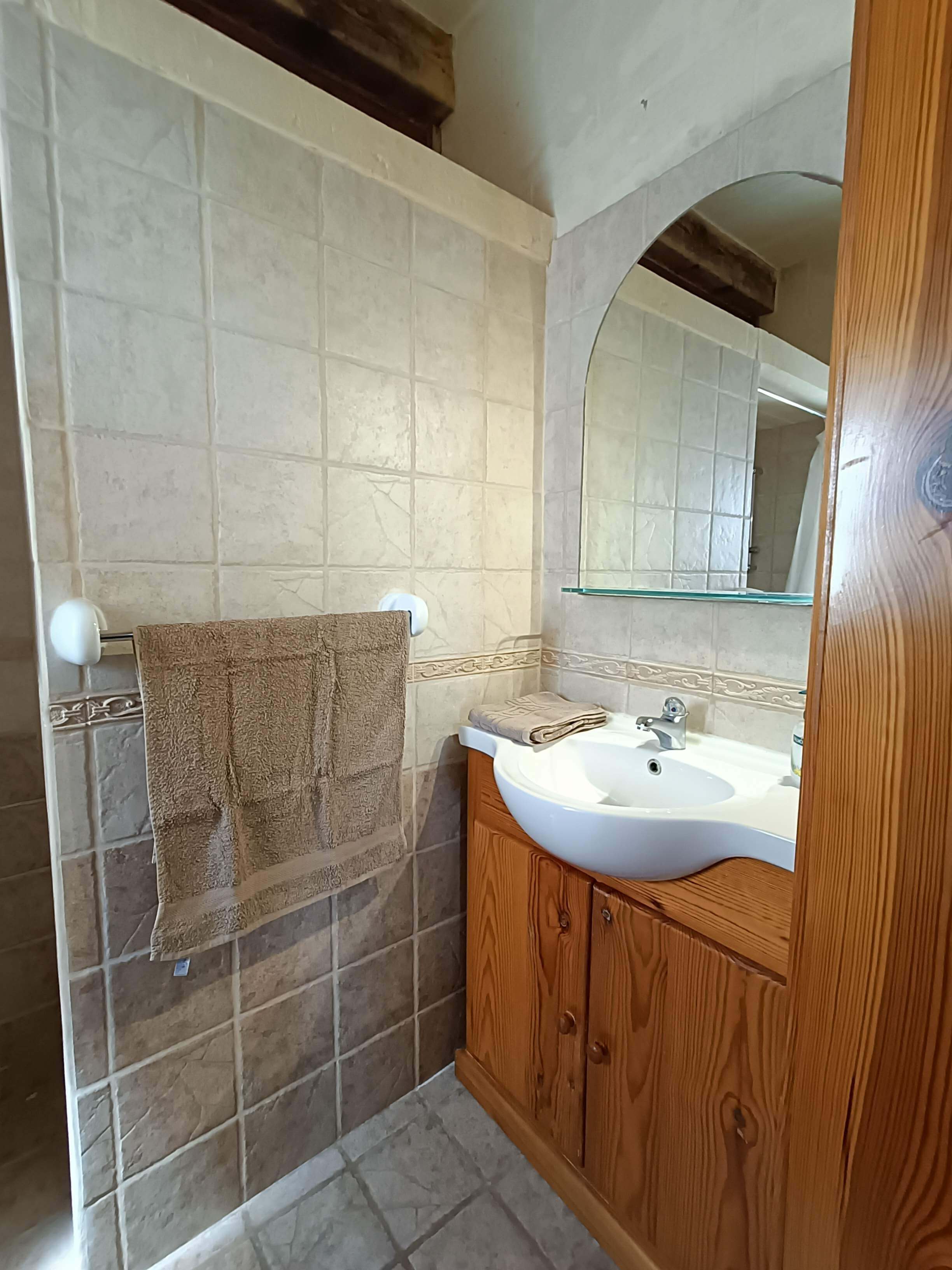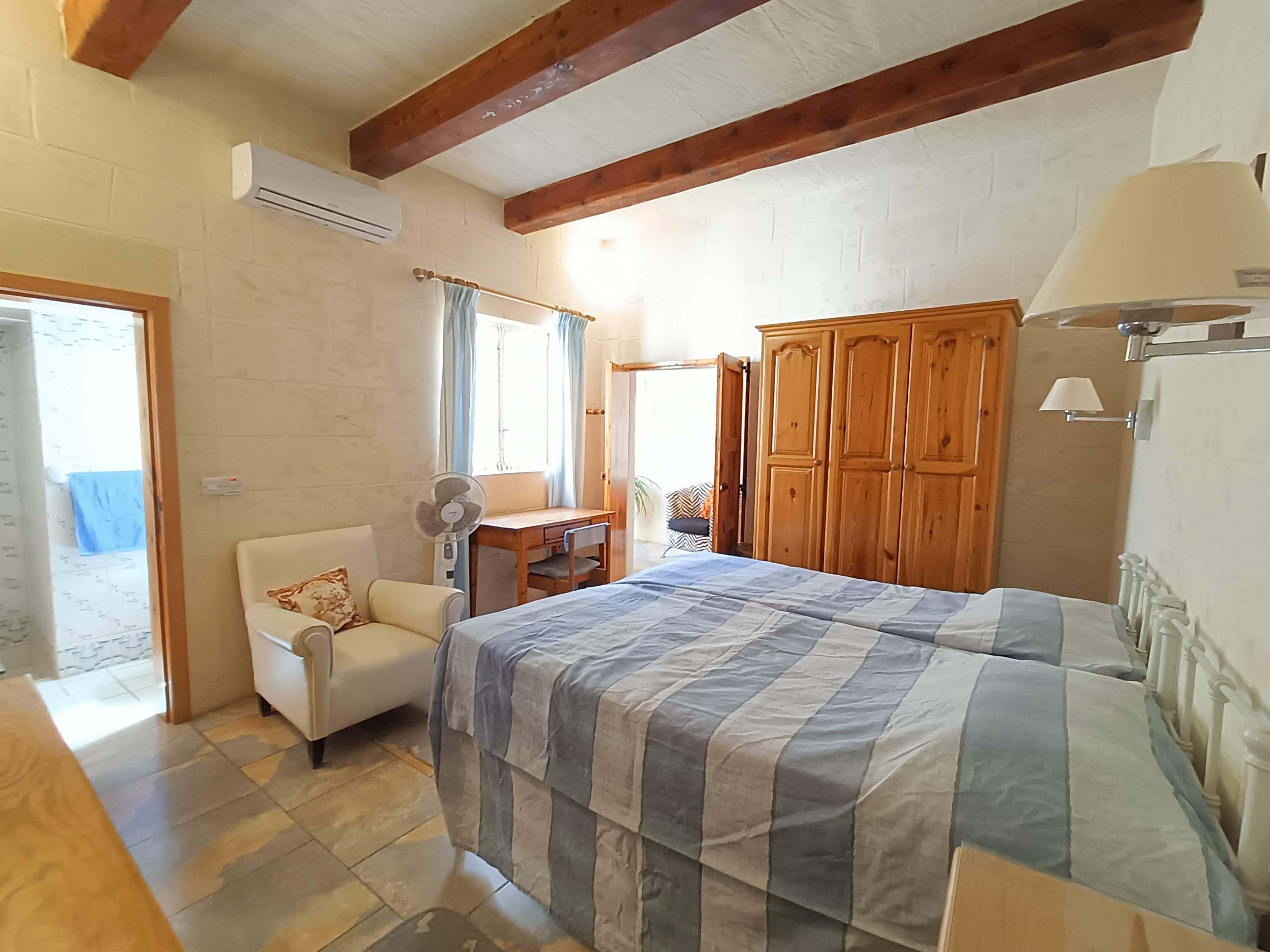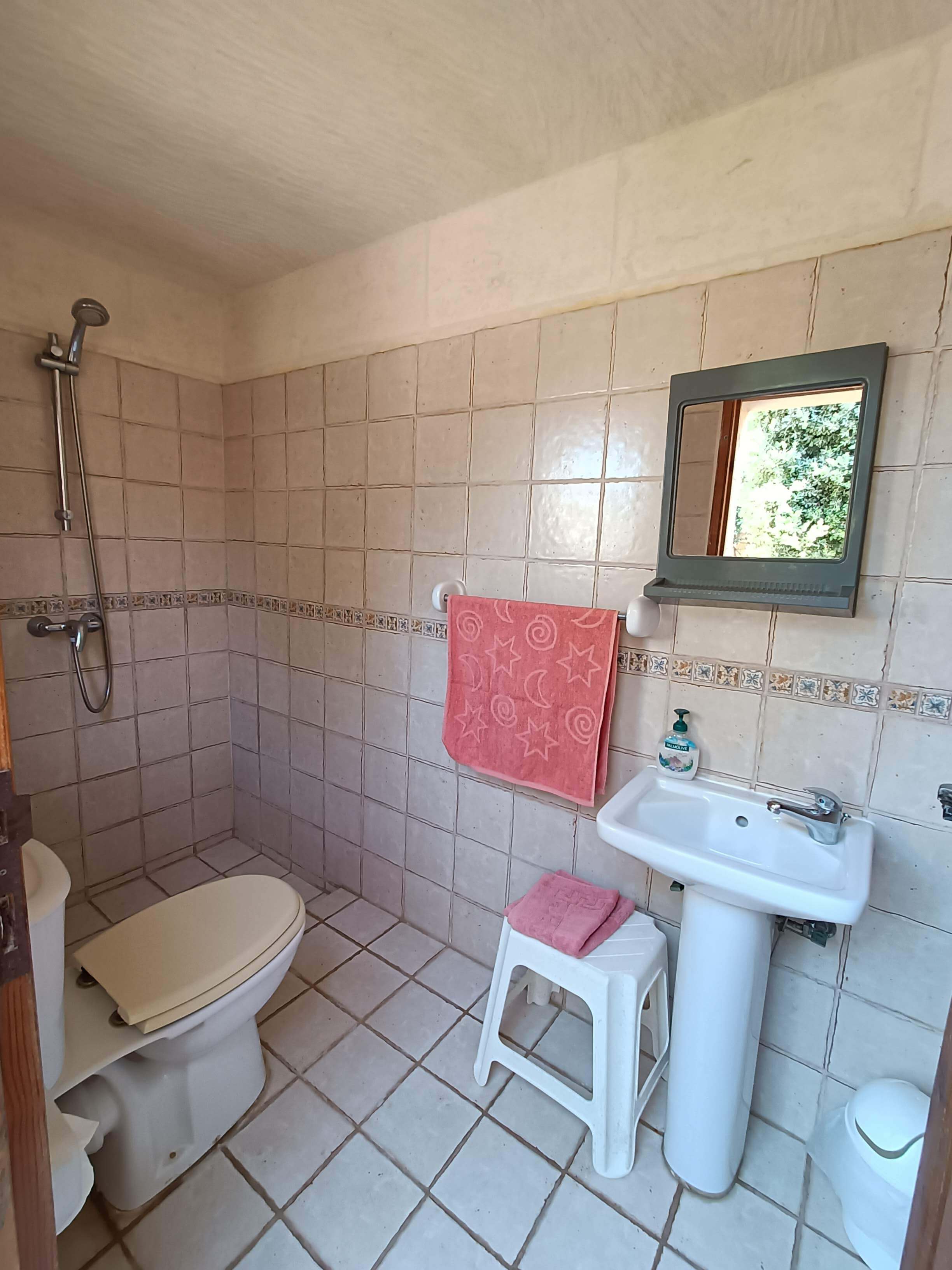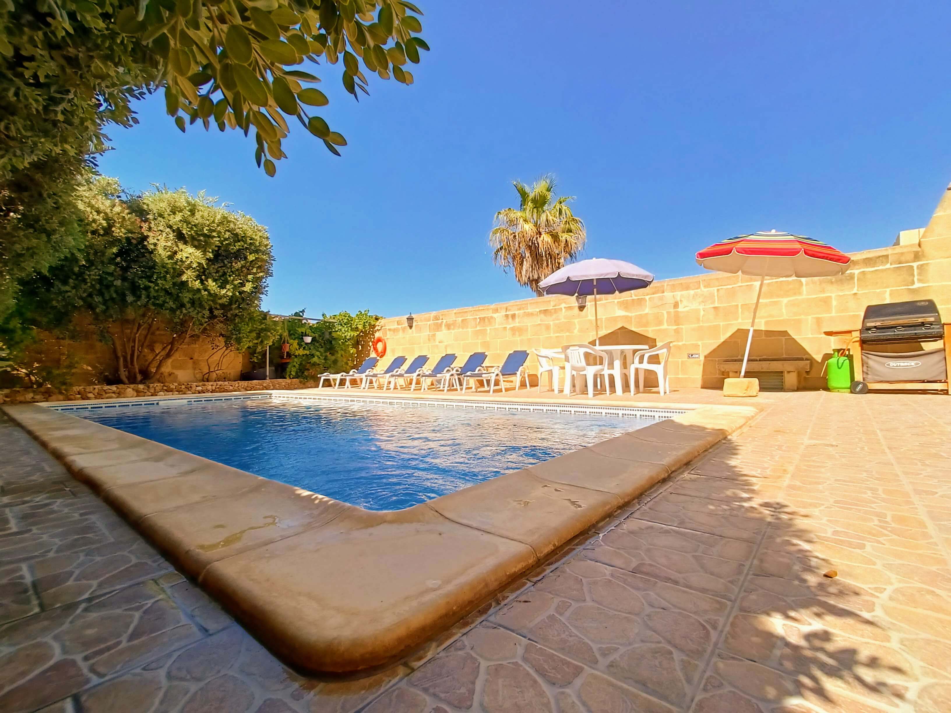 At ground floor level, one finds a twin bedroom with en-suite (shower, WC and washbasin). There is also a small lobby with seating and separate shower, WC and washbasin. From the lobby, one can access a large combined kitchen, dining and sitting room. The kitchen is equipped with all that you require, including a built in hob, oven, microwave, combined fridge-freezer, dishwasher and T.V. The kitchen leads to a terrace equipped with a BBQ and pool shower, W.C and a washbasin. Outside one finds a large pool area with a private swimming pool, deck chairs and other outdoor furniture.